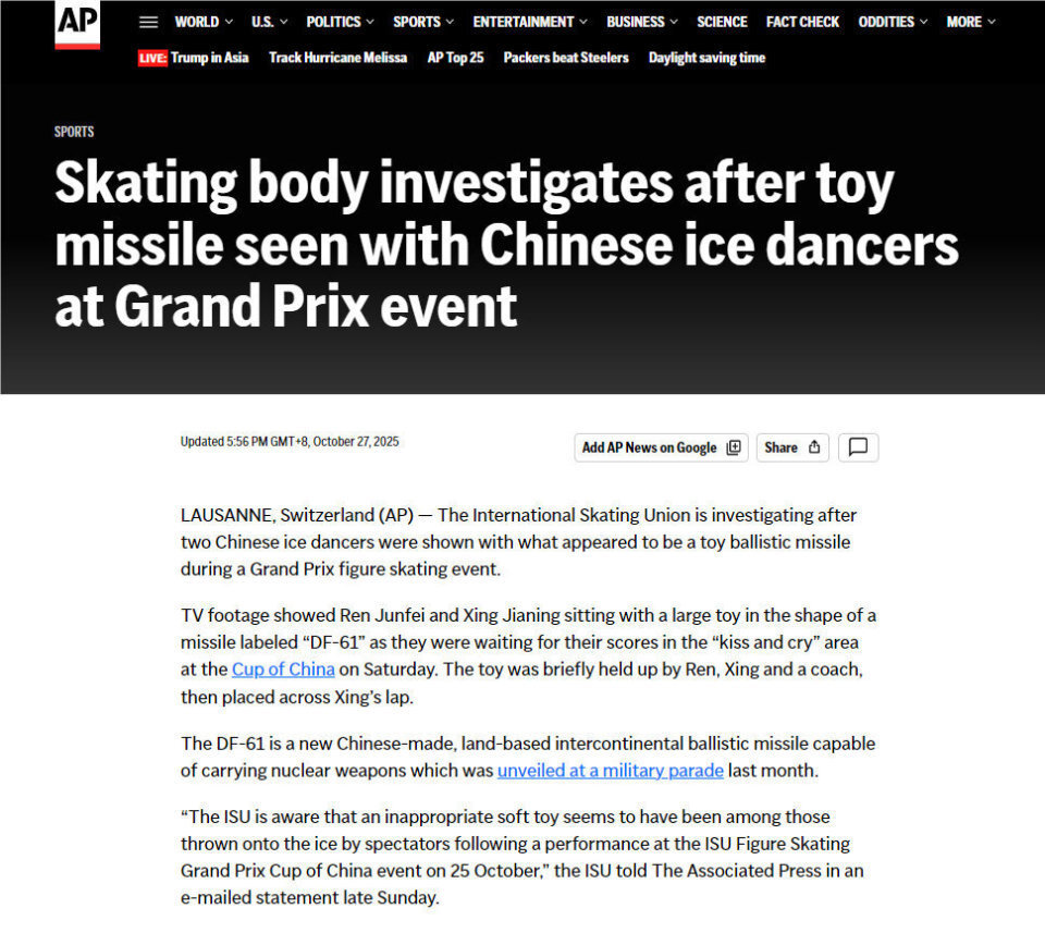 美联社、英国《卫报》等多家主流媒体也纷纷报道了此事。在巨大的压力下,国际滑联在10月26日给美联社发布声明,确认他们已经知悉“观众向选手投掷了不合适的玩偶”,他们对此感到遗憾,并承诺要调查此事。